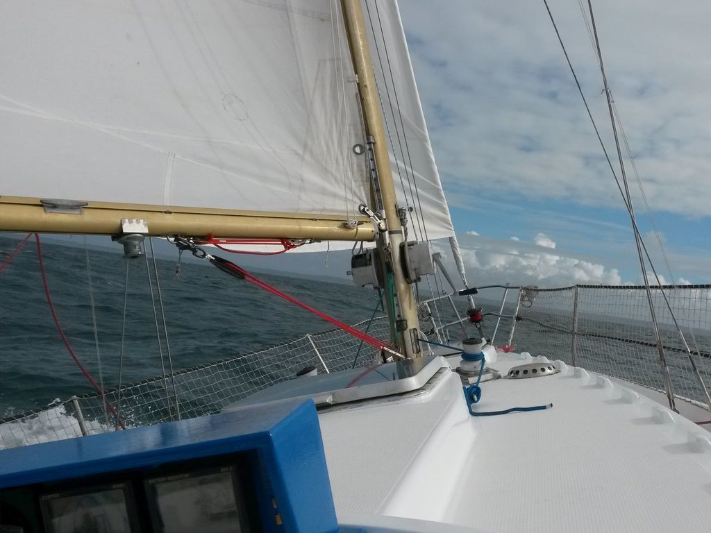 Cat commence par me donner un coup de main pour monter la grand-voile car ça secoue pas mal. Julien se repose dans la cabine avant et Antoine se tient en arrière.