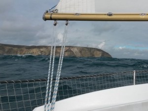 Finalement, le lendemain nous apprendrons qu’en réalité il y avait 35nd de vent. C’est effectivement un peu trop pour Ty-Gônes, mais une fois équilibré correctement en voilure, il ne tire pas sur la barre et roule tranquillement dans les vagues sans ne jamais cogner.