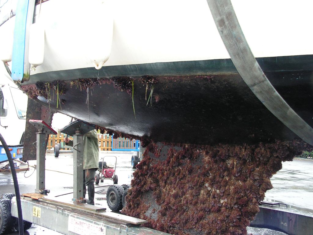 Depuis, nous sortons Ty-Gônes tous les ans pour l’hiverner sur le terre plain du port. Un bon coup de Karcher avec un petit coup de grattoir et la barbe disparait en moins de 30 min.