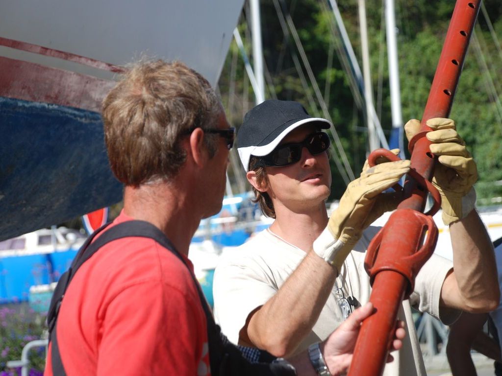 Les étais que j’avais fabriqué avec mon frère Thibault sont recourbés en haut pour ne pas s’échapper du bateau. Il faut donc les mettre en place tant qu’on a de la place sur les cotés et une échelle à proximité.